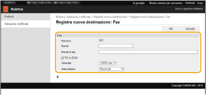 È possibile specificare anche [TX in ECM] e[Velocità] da <Impostazioni fax> ( <Invia>) nel pannello operativo. Tuttavia, le impostazioni configurate da <Rubrica> sono abilitate per le impostazioni dettagliate delle destinazioni nella Rubrica. |