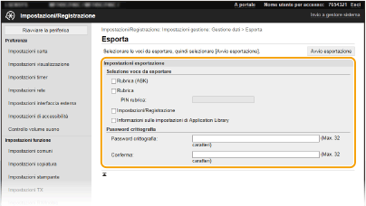 Se la casella di controllo [Rubrica (ABK)] è selezionata, non è possibile esportare le impostazioni della macchina contemporaneamente con i dati della Rubrica.
