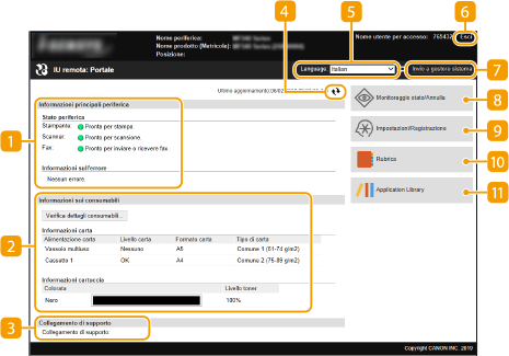 Quando si accede alla IU remota, appare la seguente pagina Portale. In questa sezione vengono descritti gli elementi visualizzati nella pagina Portale e le operazioni di base.