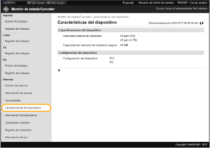 Inicie sesión en la IU remota (Inicio de la IU remota [Monitor de estado/Cancelar]  [Información del dispositivo]