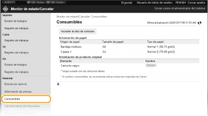 Se muestra información sobre el tamaño y el tipo de papel para el origen del papel, el número de modelo del cartucho de tóner, etc. También podrá hacer clic en [Comprobar detalles de consumibles] en la página del Portal (página principal) para mostrar esta página (Pantalla de la IU remota).