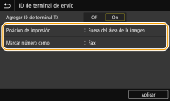 <Agregar ID de terminal TX> <Off> <On>  <Posición de impresión> <Dentro del área de la imagen> <Fuera del área de la imagen>  <Marcar número como> <Fax>  <Tel> |