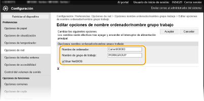 El nombre del grupo de trabajo es un nombre para agrupar varios ordenadores de forma que las funciones de red básicas, como el uso compartido de archivos, estén disponibles en una red Windows. Introduzca caracteres alfanuméricos en el nombre del grupo de trabajo al que pertenece el equipo.