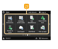 ![]() | <Papirinnst.>Denne knappen brukes til å angi format og type for papiret som er lagt inn i papirskuffen og flerfunksjonsskuffen. Spesifisere papirformat og -type <Mobil portal>Bruk dette for å opprette en direkte trådløs tilkobling til en mobilenhet. Koble til med mobile enheter <Innst. for startskjermbilde>Lar deg endre rekkefølgen for knappene på Hjem. Tilpasse Hjem-skjermen <Oppdater fastvare>Lar deg oppdatere fastvaren via Internett. Oppdatere fastvare <ID-kortkopi>Bruk denne funksjonen til å kopiere front- og baksiden på et førerkort eller andre kort, til samme siden på ett ark. ID-kortkopi <Passkopi>Lar deg kopiere flere pass på ett ark. Lage kopier av pass <Brukerveiledn.>Trykk for å vise brukerveiledning og feilårsaker/-løsninger. <Trådløst LAN- innstillinger>Bruk denne knappen for innstillinger for trådløst LAN. Koble til trådløst LAN |