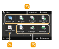 ![]() | <Kopi>Bruk denne knappen til å starte kopiering. Kopiere <Faks>Bruk denne knappen til å sende en faks fra maskinen. Faksing <Skann>Skanner et dokument og konverterer det til en elektronisk fil. Du kan lagre skannede filer på datamaskinen eller sende dem via e-post. Skanning <Minnem.utskrift>Skriver ut filer lagret på en USB-minneenhet. Skrive ut fra en USB-minneenhet (utskrift fra minnemedia) <Sikker utskrift>Bruk denne funksjonen til å skrive ut et sikret dokument. Skrive ut et dokument som er sikret med en PIN-kode (konfidensiell utskrift) <Meny><Funksjonsinnstillinger>, <Preferanser> og mange andre maskininnstillinger har utgangspunkt fra denne knappen. Innstillingsmenyliste <Adressebok>Bruk denne til å lagre eller redigere mottakere for e-poster og fakser. Du kan også vise en lagret mottaker ved sending av en e-post eller faks. Registrere mottakere <Application Library-veiledn.>Viser en beskrivelse av Application Library (Applikasjonsbibliotek). |