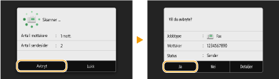 Hvis du vil avbryte sending av fakser umiddelbart etter at du har valgt <Start>, velger du <Avbryt> på skjermen eller trykker på på betjeningspanelet. Du kan også avbryte sending av fakser etter at du har kontrollert faksstatusen.