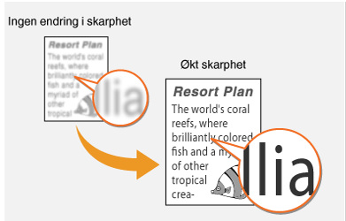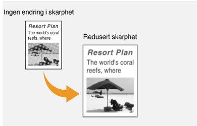 | | Du kan justere skarpheten for bildet. Øk skarphet for å få skarpere tekst og linjer eller reduser skarpheten for å forbedre utseendet til bilder fra ukeblader. Justere skarpheten |