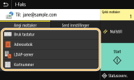 Hvis en mottaker velges fra <Adressebok> på Hjem-skjermen, kan skjermbildet Grunnleggende funksjoner for sending av I-faks vises mens den valgte mottakeren fortsatt er angitt. |