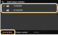 2 | Merk av i avkrysningsboksen for den mottakeren som skal slettes og velg <Fjern fra Mott.>. ![]() ![]() Hvis du merket av i avkrysningsboksen for gruppeanrop, kan du vise mottakerne som er registrert i gruppen ved å velge <Detaljer> <Mottaker>. |