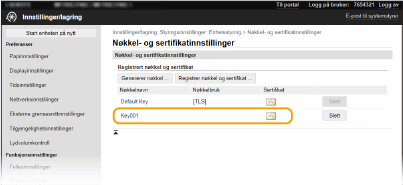 En nøkkel og sertifikat kan ikke slettes hvis det er i bruk til et formål, for eksempel når "[TLS]" eller "[IEEE 802.1X]" vises under [Nøkkelbruk]. Hvis dette er tilfelle, må du deaktivere funksjonen eller erstatte nøkkelen og sertifikatet før du sletter dem.