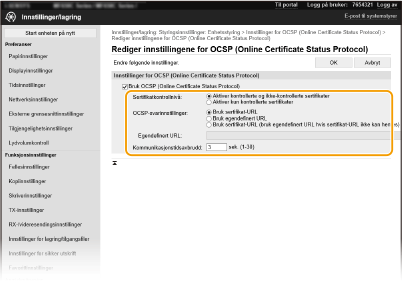 Når [Bruk egendefinert URL] eller [Bruk sertifikat-URL (bruk egendefinert URL hvis sertifikat-URL ikke kan hentes)] er valgt, angir du URL-adressen for OCSP-responderen (kun ASCII-kode, maks. 255 tegn).