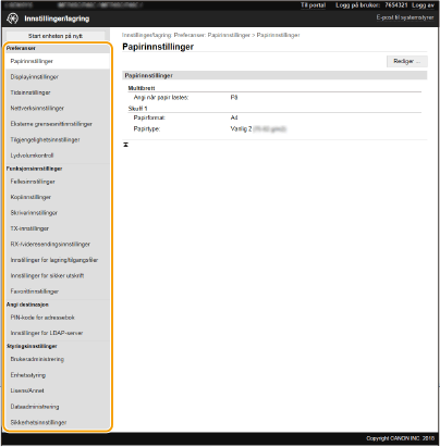 Klikk på [Innstillinger/lagring] på Portal-siden.