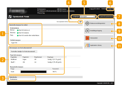 Når du logger inn på Fjernkontroll, vises følgende Portalside. Denne delen beskriver elementene som vises på Portalsiden og de grunnleggende handlingene.