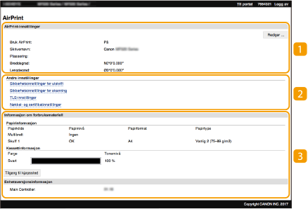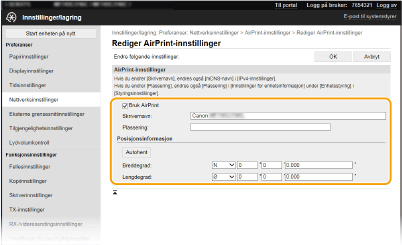 Lar deg kontrollere verdiene som er angitt i innstillingene for AirPrint, som navn og plassering for maskinen. Du kan klikke på [Rediger] hvis du vil endre innstillingene.
