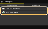 Sjekke statusen for sendte dokumenter1 | Velg dokumentet som du vil kontrollere statusen for i <Sendejobbstatus>-kategorien. ![]() Viser detaljert informasjon om dokumentet. Hvis du har angitt flere mottakere, vil antallet angitte mottakere vise på skjermen. Sjekk detaljene for angitte, flere mottakere ved å velge <Mottaker>. |
