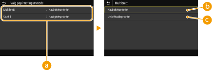 Tilgjengelig papir), brukes <Hastighetsprioritet> for papirkilden i stedet. I slike tilfeller må du legge inn papiret på samme måte som når <Hastighetsprioritet> er valgt (