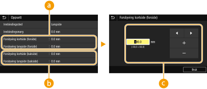 For <Forskyving kortside (forside)>/<Forskyving kortside (bakside)> skal du angi en verdi med et "+"-tegn for å flytte utskriftsposisjonen til venstre eller høyre. For <Forskyving langside (forside)>/<Forskyving langside (bakside)> skal du angi en verdi med et "+"-tegn for å flytte utskriftsposisjonen opp eller ned. Angi en verdi med et "-"-tegn for å flytte i motsatt retning.