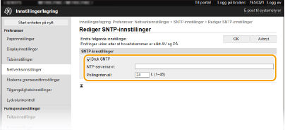 SNTP for maskinen støtter både NTP-servere (versjon 3) og SNTP-servere (versjon 3 og 4). Hvis du vil ha mer informasjon om grunnleggende handlinger som skal utføres ved oppsett av maskinen fra Fjernkontroll, kan du se Konfigurere menyalternativer fra grensesnittet for Fjernkontroll. |