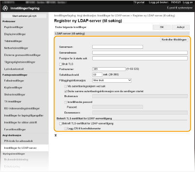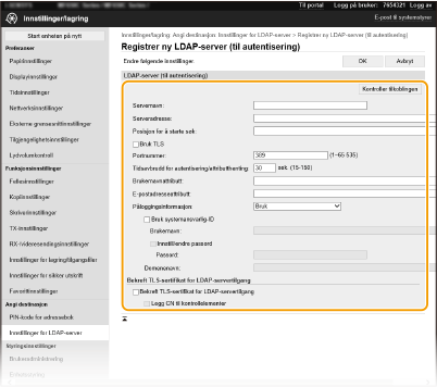 Registrering av LDAP-server må utføres separat, enten for søk eller godkjenning. For å bruke en LDAP-server til søk etter faks- og e-postmottakere, må den registreres for søking, og for å bruke den til godkjenning ved sending av e-poster eller fakser, må den registreres for autentisering.