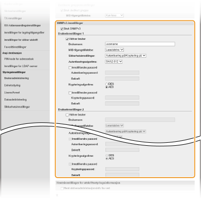 Simple Network Management Protocol (SNMP) er en protokoll for å overvåke og kontrollere kommunikasjonsenheter på et nettverk ved å bruke Management Information Base (MIB). Maskinen støtter SNMPv1 og SNMPv3 med forbedret sikkerhet. Du kan kontrollere statusen for maskinen fra en datamaskin når du skriver ut dokumenter, eller du kan bruke Fjernkontroll. Du kan aktivere SNMPv1 eller SNMPv3, eller begge deler samtidig. Angi innstillingene for hver versjon slik at de passer til nettverksmiljøet og bruksformålet.