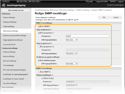 Velg [Lese/skrive] eller [Kun lese] for hver gruppe, for tilgangsrettigheter til MIB-objekter.
