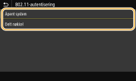 2 | Velg en godkjenningsmetode. ![]() <Åpent system> Angir åpen systemgodkjenning, som også kalles for "åpen godkjenning". <Delt nøkkel> Bruker krypteringnøkkelen som passord. ![]() Når <Åpent system> er valgt Når du kobler til et trådløst LAN, oppstår det en godkjenningsfeil på maskinen hvis godkjenningen av den delte nøkkelen er angitt på den trådløse ruteren. Hvis dette skjer, endrer maskinen automatisk innstillingen til <Delt nøkkel> og prøver tilkoblingen på nytt. |