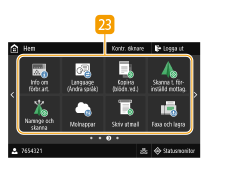 ![]() | <Pappersinst.>Den här knappen används för att ange format och typ för papperet som är påfyllt i papperslådan eller universalfacket. Ange pappersformat och -typ <Mobil portal>Använd denna knapp för att upprätta en anslutning till en mobil enhet. Ansluta till mobila enheter <Inställn. hemskärm>Här kan du ändra i vilken ordning som Hem-skärmknapparna visas. Anpassa skärmen Hem <Uppdatera firmware>Det går att uppdatera firmware via Internet. Uppdatera firmware <ID-kortskopia>Använd den här funktionen för att kopiera fram- och baksidan av körkort och andra ID-handlingar på en och samma papperssida. Kopiera ID-kort <Passkopia>Du kan kopiera flera pass på samma sida. Göra passkopior <Funktionsguide>Tryck för att visa bruksanvisning och felorsaker/lösningar. <Inst. för trådlöst LAN>Använd den här knappen för att ange inställningar för trådlöst LAN. Ansluta till ett trådlöst nätverk |