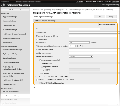Registrering av LDAP-server behöver göras separat för sökning respektive autenticering. För att använda en LDAP-server för sökning efter fax- och e-postmottagare registrerar du den för sökning och för att använda den för autentisering vid sändning av e-post eller fax registrerar du den för autentisering.