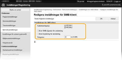 Ange inställningarna som ska användas när enheten ansluter till nätverket som en SMB-klient.