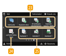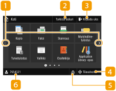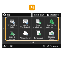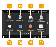 ![]() | <Paperiasetukset>Tätä painiketta käytetään paperikasettiin ja monikäyttötasolle lisätyn paperin koon ja tyypin määrittämiseen. Paperikoon ja -tyypin määrittäminen <Mobiiliportaali>Tämän avulla voit muodostaa yhteyden mobiililaitteeseen. Yhdistäminen mobiililaitteisiin <Kotinäytön asetukset>Tämän avulla voit muuttaa järjestyksen, jossa Koti-näytön painikkeet näytetään. Koti-näytön mukauttaminen <Päivitä laiteohjelmisto>Sallii laiteohjelmiston päivittämisen Internetin kautta. Laiteohjelmiston päivitys <ID-korttikopio>Tämän toiminnon avulla voit kopioida ajokortin tai muun kortin etu- ja kääntöpuolen yhden arkin samalle puolelle. ID-kortin kopioiminen <Passikopio>Voit kopioida useita passeja yhdelle arkille. Passien kopiointi <Toiminto-opas>Paina tätä, kun haluat nähdä käyttöohjeita ja virheiden syitä/ratkaisuja. <Langattoman LANin aset.>Käytä tätä painiketta, kun haluat määrittää langattoman lähiverkon asetukset. Yhdistäminen langattomaan lähiverkkoon |