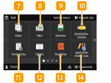 ![]() | <Kopio>Aloita kopiointi painamalla tätä painiketta. Kopioiminen <Faksi>Lähetä faksi laitteesta painamalla tätä painiketta. Faksaaminen <Skannaus>Skannaa alkuperäisen ja muuntaa sen elektroniseen muotoon. Voit tallentaa skannattuja tiedostoja tietokoneeseen tai lähettää niitä sähköpostin kautta. Skannaus <Muistiväline- tulostus>Tulostaa USB-muistilaitteeseen tallennettuja tiedostoja. Tulostaminen USB-muistista (muistivälinetulostus) <Turvatulostus>Käytä tätä toimintoa turvatulostusasiakirjan tulostamiseen. PIN-koodilla suojatun asiakirjan tulostaminen (turvatulostus) <Valikko><Toimintoasetukset>, <Yleisasetukset> ja monet muut laitteen asetukset aloitetaan tällä painikkeella. Asetusvalikkoluettelo <Osoitekirja>Käytä tätä painiketta vastaanottajien tallentamiseen tai muokkaamiseen sähköpostien tai faksin lähettämistä varten. Voit myös tallentaa tai muokata vastaanottajia sähköpostien tai faksien lähettämistä varten. Vastaanottajien tallentaminen <Application Library -opas>Näyttää Application Libraryn (Sovelluskirjasto) kuvauksen. |