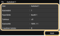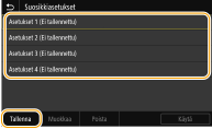 Jos haluat poistaa tallennetun asetuksen, valitse <Kopio>  <Muut asetukset>  <Suosikkiasetukset>  valitse asetukset ja valitse <Poista>  <Kyllä>.