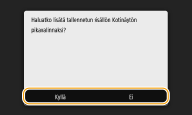 Jos valitset <Kyllä>, näyttöön tulee viesti. Tarkista viesti ja valitse <OK>. Tallennettu asetusyhdistelmä lisätään Koti-näyttöön pikavalintapainikkeeksi.