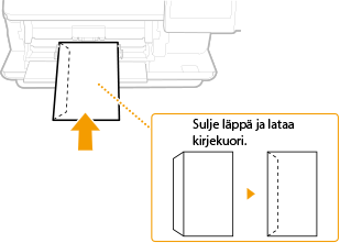 Tasoita mahdolliset käpristymät kirjekuorista ennen niiden lisäämistä. Kiinnitä huomiota myös kirjekuorien suuntaan ja siihen, kumpi puoli on ylöspäin. Paperikasettiin ei voi lisätä kirjekuoria.