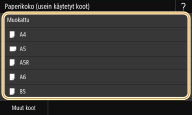 Jos yllä olevaa näyttöä ei näytetä, kun paperia lisätäänJos monikäyttöalustalle lisätään aina samaa paperia, voit ohittaa paperiasetustoiminnot tallentamalla paperikoon ja -tyypin oletusasetukseksi. Kun oletusasetus on tallennettu, yllä olevaa näyttöä ei näytetä. Voit tuoda näytön esiin valitsemalla <Määritä paperin lataaminen> (Monikäyttötason oletuspaperiasetusten tallentaminen). |