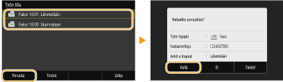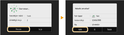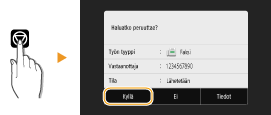 Jos haluat peruuttaa faksien lähetyksen heti, kun on valittu <Aloita>, valitse näytöstä <Peruuta> tai paina käyttöpaneelissa . Voit peruuttaa faksin lähetyksen myös sen jälkeen, kun olet tarkistanut faksin tilan.