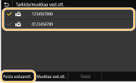 2 | Valitse poistettavan vastaanottajan valintaruutu ja valitse <Poista vastaanott.>. ![]() ![]() Jos valitset Ryhmävalinta-valintaruudun, voit tarkastella ryhmään tallennettuja vastaanottajia valitsemalla <Tiedot> <Vastaanottaja>. |