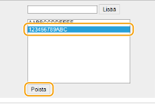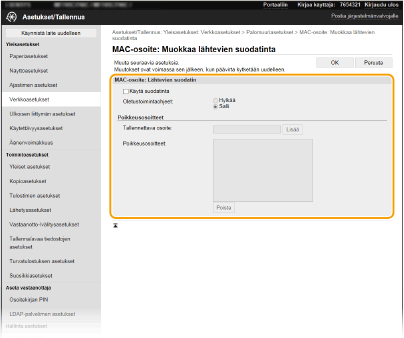 2 | Määritä poikkeusosoitteet. Syötä MAC-osoite [Tallennettava osoite] -kenttään ja napsauta [Lisää]. Osoitetta ei tarvitse erotella tavuviivoilla tai kaksoispisteillä. ![]() Tarkista, ettei syötössä ole tapahtunut virheitä Jos MAC-osoitteet on syötetty väärin, et ehkä pysty käyttämään laitetta etäkäyttöliittymästä, missä tapauksessa <MAC-osoitesuodatin>-asetukseksi täytyy valita <Ei>. <MAC-osoitesuodatin> ![]() Kun lähtevien suodattimeksi on valittu [Hylkää] Lähteviä monilähetys- ja sarjalähetyspaketteja ei voi suodattaa. MAC-osoitteen poistaminen poikkeuksista Valitse MAC-osoite ja napsauta [Poista]. ![]() | ||||