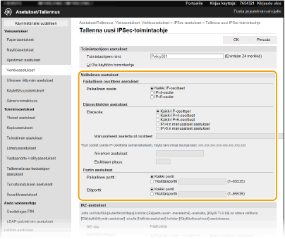 Valitsin määrittää IP-pakettien ehdot, kun käytetään IPSec-tiedonsiirtoa. Valittavissa oleviin ehtoihin sisältyvät laitteen IP-osoitteet ja porttinumerot sekä laitteet joiden kanssa kommunikoidaan.
