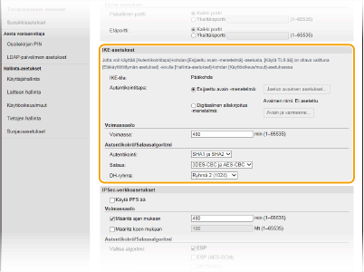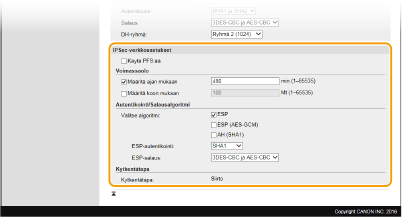 Valitse [ESP]-, [ESP (AES-GCM)]- tai [AH (SHA1)] -valintaruutu/-ruudut IPSec-otsikon ja käytetyn algoritmin mukaan. AES-GCM on algoritmi, jota käytetään sekä todennukseen että salaukseen. Jos [ESP] on valittu, valitse myös algoritmit todennusta ja salausta varten avattavista luetteloista [ESP-autentikointi] ja [ESP-salaus].