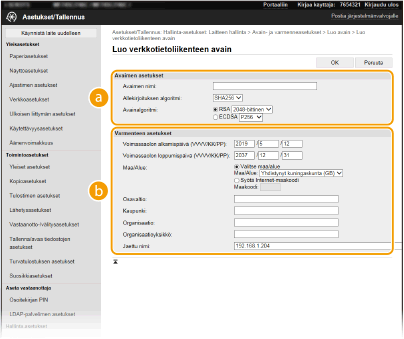 Avain ja varmenne voidaan luoda laitteen avulla, kun sitä vaaditaan salattuun TLS (Transport Layer Security) -tiedonsiirtoon. Voit käyttää TLS-salausta, kun käytät laitetta etäkäyttöliittymällä. Verkkotietoliikenne-kohdassa luodun avaimen ja varmenteen kanssa käytetään itse allekirjoitettuja varmenteita.