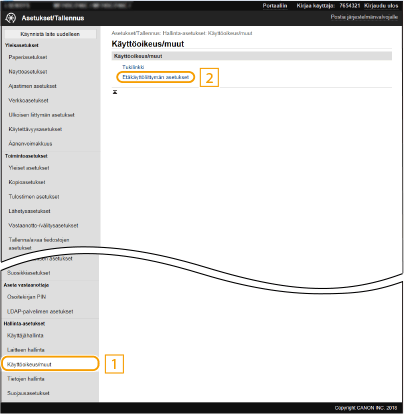 Käyttöpaneelin käyttäminenVoit ottaa TLS-salatun tiedonsiirron käyttöön tai poistaa sen käytöstä myös Koti-näytön kohdassa <Valikko>. <Etäkäyttöliittymä> Etäkäyttöliittymän käynnistäminen TLS:n kanssaJos etäkäyttöliittymää yritetään käynnistää, kun TLS on käytössä, turvallisuusvarmennetta koskeva suojausvaroitus voi tulla esiin. Tarkista tällöin, että osoitekenttään on syötetty oikea URL-osoite, ja siirry sitten etäkäyttöliittymän näyttöön. Etäkäyttöliittymän käynnistäminen TLS:n käyttäminen sähköposti-/I-Fax-tiedonsiirron salaamiseenJos SMTP- ja POP3 -palvelin tukevat TLS-salausta, voit ottaa TLS-tiedonsiirron salauksen käyttöön näille palvelimille (Sähköpostin/I-faksin tiedonsiirtoasetusten määrittäminen). Lisätietoja SMTP- ja POP3-palvelimien asetuksista saat Internet-palveluntarjoajaltasi tai verkon pääkäyttäjältä. |