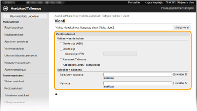 Valitse vietävät asetukset ja määritä salauksen salasana.