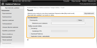 Valitse valintaruutu, kun haluat tuoda Application Library (Sovelluskirjasto) -asetustiedot.