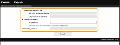 Voit käyttää kaikkia etäkäyttöliittymän toimintoja ja asetuksia. Syötä oikea tunnus kohtaan [Järjestelmänvalvojan tunnus] ja PIN-koodi kohtaan [Järjestelmänvalvojan PIN].