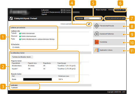 Näyttää paperin tiedot ja väriainekasettien jäljellä olevan väriaineen määrän.