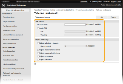 2 | Määritä tarvittavat asetukset. [Osastotunnus] Syötä tallennettava osastotunnuksen numero. [Aseta PIN] Aseta PIN-koodi valitsemalla tämä valintaruutu ja syöttämällä enintään sama numero sekä [PIN]- että [Vahvista]-tekstiruutuihin. [Rajoita toimintoja] Voit rajoittaa tulostettavien sivujen määrää ja käytettävissä olevia toimintoja osastoille, jotka tallennetaan. Jos haluat rajoittaa tulostettavien sivujen määrä, valitse kohdetyypin valintaruutu ja syötä asianmukainen sivujen määrä kohtaan [Sivujen määrä]. Valitse niiden kohdetoimintojen valintaruutu, joita haluat rajoittaa. Jos [Rajoita skannausta] valintaruutu on valittu, tallennus USB-muistilaitteeseen, sähköpostin lähetys ja tallennus jaettuun kansioon tai FTP-palvelimen toiminnot ovat kaikki rajoitettuja. Voit myös rajoittaa muita menetelmiä, jotka skannaavat asiakirjoja tuomalla ne tietokoneeseen, mutta tällöin et voi estää osastotunnusten pääsyä ( Töiden estäminen, kun osastotunnus on tuntematon). |