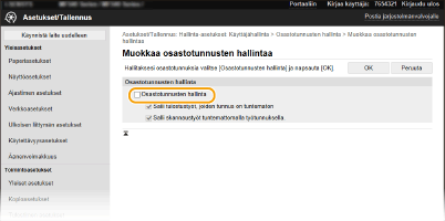 Osastotunnuksen ottaminen käyttöön töiden suorittamiseen tietokoneesta). Jos tämän asetuksen valintaruutu on kuitenkin valittu, työt suoritetaan, vaikka tunnusta ja PIN-koodia ei syötettäsi. Jos haluat määrittää asetuksen niin, että mitään työtä ei suoriteta, ellei oikeaa osastotunnusta ja PIN-koodia ole syötetty, tyhjennä valintaruutu.