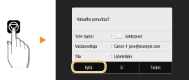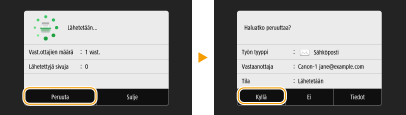 Jos haluat peruuttaa asiakirjojen lähetyksen heti, kun olet valinnut <Aloita>, valitse näytössä <Peruuta> tai paina . Voit peruuttaa asiakirjojen lähetyksen myös sen jälkeen, kun olet tarkistanut lähetyksen tilan.