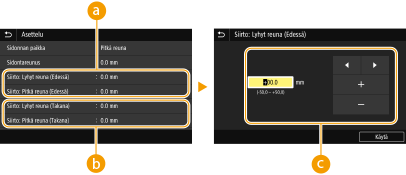 Määritä kohdassa <Siirto: Lyhyt reuna (Edessä)>/<Siirto: Lyhyt reuna (Takana)> arvo, jolla on +-etumerkki, kun haluat siirtää tulostuskohtaa vasemmalle tai oikealle. Määritä kohdassa <Siirto: Pitkä reuna (Edessä)>/<Siirto: Pitkä reuna (Takana)> arvo, jolla on +-etumerkki, kun haluat siirtää tulostuskohtaa ylös tai alas. Kun haluat siirtää vastakkaiseen suuntaan, määritä arvo, jolla on –-etumerkki.